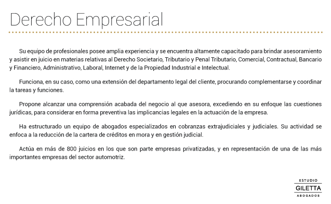 Dado el proceso de globalización; la preponderancia del accionar de organismos internacionales; el agrupamiento de los países en uniones regionales; la tendencia a la uniformidad de la legislación y la generalización del uso de la tecnología informática, en 2001 el Estudio decidió diversificar sus servicios profesionales, asistiendo a sus clientes en todas las áreas del derecho local, sin desnaturalizar sus Valores y respetando la calidad artesanal que lo distinguió desde su origen. Desde entonces mantiene fluida relación con otros estudios jurídicos de primera línea que brindan asesoramiento de excelencia en materias en desarrollo y dispone de corresponsales en las principales jurisdicciones del país para la asistencia en asuntos regionales o en juicios radicados en ellas.